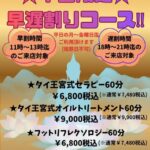 2025年10月6日 / 最終更新日時 : 2025年10月6日 bhspa 🍁秋の癒しペア割キャンペーン🍁SPA高槻本店👑 🍁秋の癒しを“タイ王宮セラピー”で🍁 こんにちは🥰🧡バーン・ハナSPA&Beauty高槻本店です🌿🐘 朝晩が涼しくなり、少しずつ秋の気配を感じる季節になりましたね🍂夏の疲れが残るこの時期、身体をゆるめてリセットしませんか […]