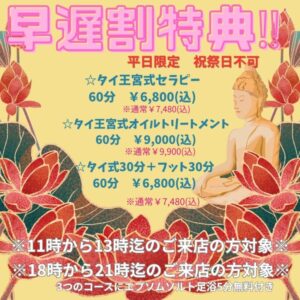 お昼休み🌞お仕事帰りに🌛平日限定♪早遅割特典♪のご案内👑SPA高槻本店